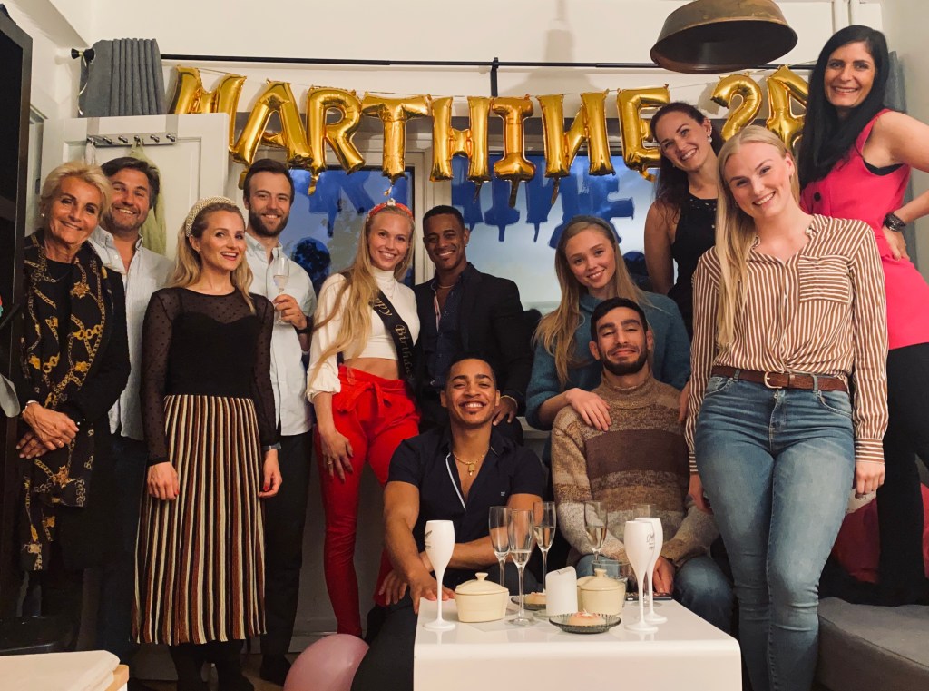 Jeg hadde ikke planlagt noe feiring, og skulle undervise et par timer på ettermiddagen. Etter det hentet mamma og pappa meg, og vi dro ut og spiste en nydelig middag. Det var kjempekoselig, og jeg var egentlig mer enn fornøyd med det! De kjørte meg hjem, og sa de ville se hvordan leiligheten hadde blitt. Jeg tenkte ikke noe over det, og tok de med meg inn… Da så jeg masse ballonger og champagneglass, og denne flotte gjengen kom ut fra rommet!